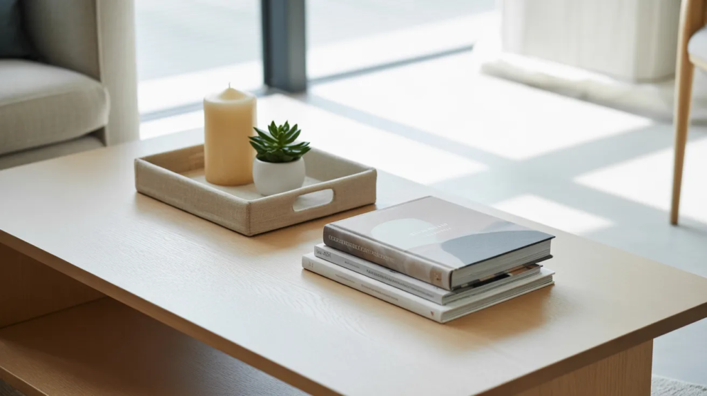 Add one book, one candle, and one small plant for a balanced setup. Keep it minimal so it doesn’t become a dumping spot. This is a budget-friendly way to make your apartment look tidy and intentional every day.