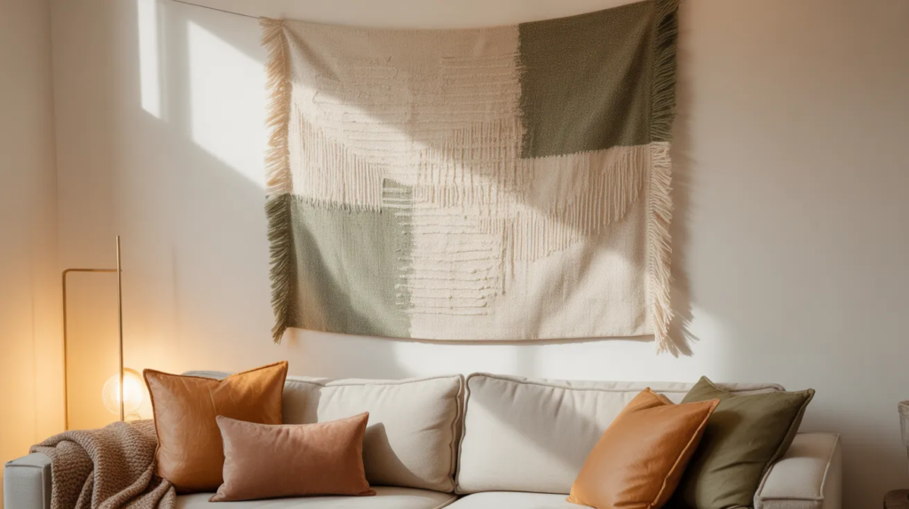 Use removable hanging strips or a tension rod for tapestries. Choose a calm pattern so it doesn’t overwhelm the space. This idea is perfect for renters who want statement walls without paint or wallpaper.