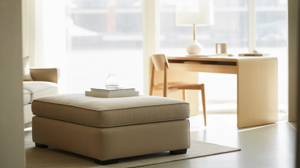 Pick pieces in neutral colors so they blend in and don’t visually crowd the room. Add a tray on the ottoman to keep it looking neat. This is a budget-friendly way to make your space feel bigger and work better.